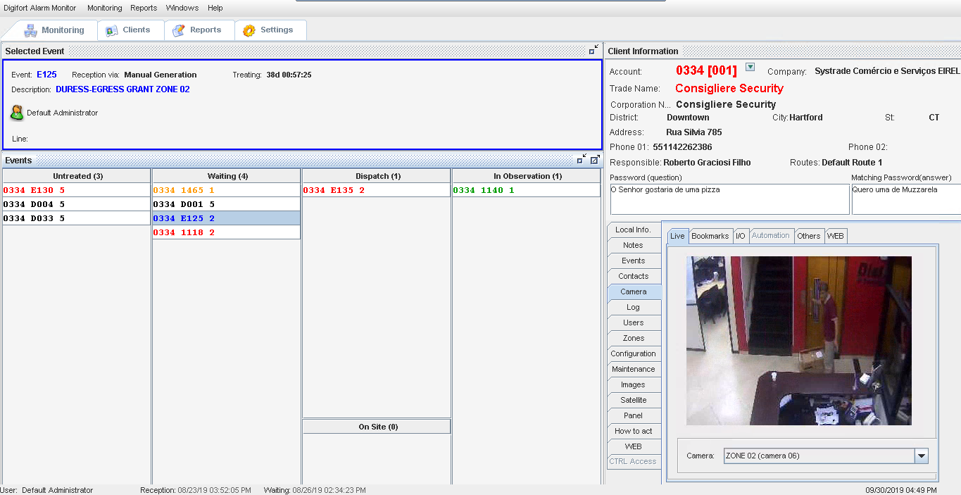 Ao selecionar um evento, o operador rapidamente tem acesso as informações do cliente que teve um alerta disparado, podendo rapidamente ter sua tomada de decisão assistida pelo software, infomando se: